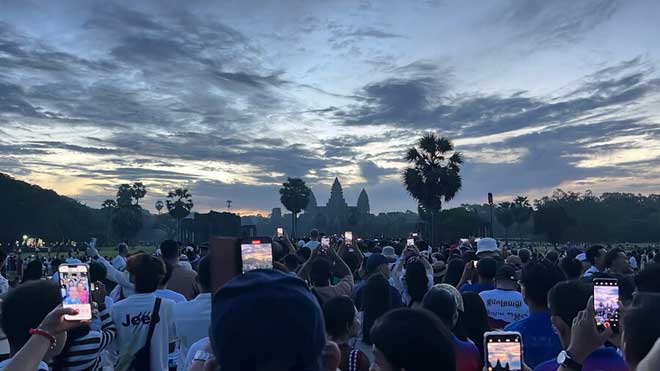 ពួកគាត់មានមោទនភាព ដែលភ្ញៀវទេសចរយ៉ាងច្រើនកុះករបានមកទស្សនាព្រឹត្តិការណ៍សមរាត្រីនេះ ខ្លះបានអង្គុយរង់ចាំនៅបរិវេណច្រាំងកសិន្ធុខាងមុខប្រាសាទ ខ្លះចូលមកអង្គុយត្រៀបត្រានៅបណ្ណាល័យ និងខ្លះទៀតឈររង់ចាំនៅលើរានហាល ក្បែរស្រះទឹកខាងជើង និងខាងត្បូងនៃប្រាសាទ ដើម្បីទស្សនាទិដ្ឋភាព និងផ្ដិតយករូបភាព ដ៏អស្ចារ្យថ្ងៃរះនៅប្រាសាទអង្គរវត្ត៕ប្រភពអាកាប៉េ