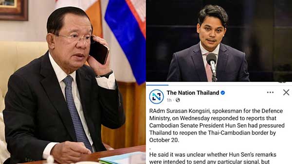 អ្នកនាំពាក្យព្រឹទ្ធសភា លោក ជា ធីរិទ្ធ បានច្រានចោលការលើកឡើងរបស់លោក Surasan Kongsiri អ្នកនាំពាក្យក្រសួងការពារជាតិថៃ ដែលបានថ្លែងនៅថ្ងៃនេះថា សម្ដេចតេជោ ហ៊ុន សែន ប្រធានព្រឹទ្ធសភា នៃព្រះរាជាណាចក្រកម្ពុជា បានដាក់សម្ពាធឱ្យប្រទេសថៃបើកច្រកព្រំដែននៅថ្ងៃទី២០ តុលា ខាងមុខនេះ។