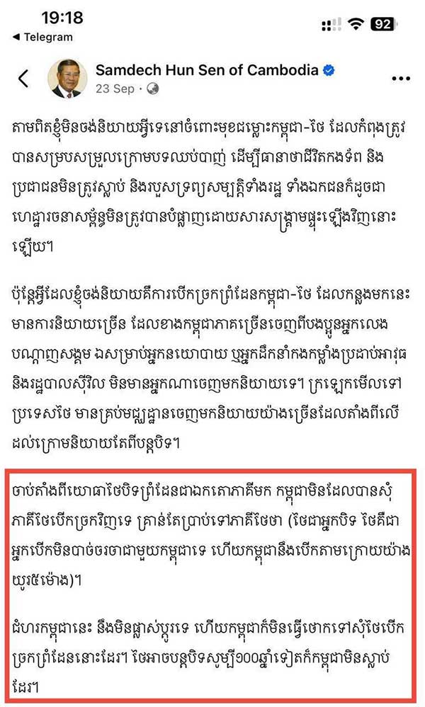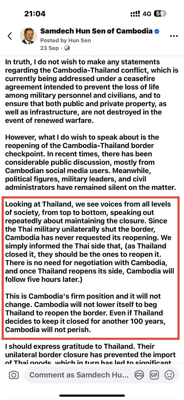សូមបញ្ជាក់ ផងដែរថា កន្លងទៅ សម្ដេចតេជោ ធ្លាប់បានបញ្ជាក់ពីជំហររបស់សម្ដេច ជាបន្តបន្ទាប់ និងបានផ្សាយលើទំព័រហ្វេសប៊ុកផ្លូវការរបស់សម្ដេច កាលពីថ្ងៃទី២៣ កញ្ញា ២០២៥ កន្លងទៅថ្មីៗនេះទៀតថា “ ចាប់តាំងពីយោធាថៃបិទព្រំដែនជាឯកតោភាគីមក កម្ពុជាមិនដែលបានសុំភាគីថៃបើកច្រកវិញទេ គ្រាន់តែប្រាប់ទៅភាគីថៃថា (ថៃជាអ្នកបិទ ថៃគឺជាអ្នកបើក មិនបាច់ចរចាជាមួយកម្ពុជាទេ ហើយកម្ពុជានឹងបើកតាមក្រោយយ៉ាងយូរ៥ម៉ោង )។